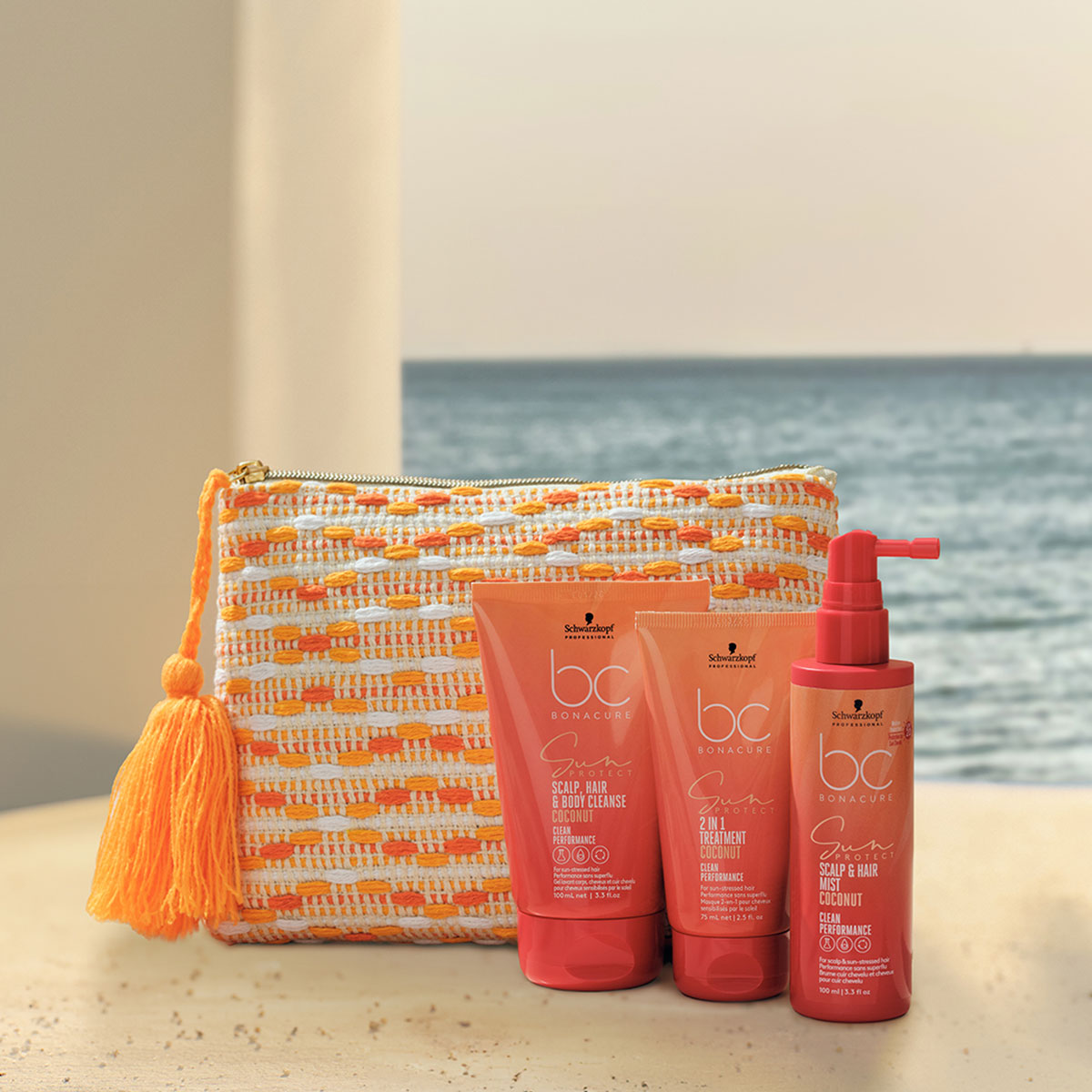 Το σετ Bonacure Sun Protect περιλαμβάνει τρία προϊόντα που μπορούν να εφαρμοστούν όχι μόνο στα μαλλιά αλλά και το σώμα σου. Συγκεκριμένα, περιέχει το Schwarzkopf Professional Bonacure Sun Protect 3-in-1 Scalp, Hair & Body Cleanse, ένα προϊόν 3 σε 1 που καθαρίζει σε βάθος τα μαλλιά, το ευαίσθητο τριχωτό της κεφαλής, αλλά και το σώμα από τα κατάλοιπα του αντηλιακού και των προϊόντων styling, την άμμο, το αλάτι και το χλώριο. Το Schwarzkopf Professional Bonacure Sun Protect 2-in-1 Treatment αποτελεί μία θεραπεία μαλλιών η οποία ενυδατώνει σε βάθος και προστατεύει τα μαλλιά από τις ακτίνες του ήλιου, ελέγχοντας το φριζάρισμα και το σπάσιμο της τρίχας. Τέλος, το Schwarzkopf Professional Bonacure Sun Protect 10-in-1 Summer Fluid, αποτελεί μία κρέμα που όχι μόνο θρέφει και αναδομεί τα ταλαιπωρημένα από τον ήλιο μαλλιά, αλλά και τα προστατεύει από τη θερμότητα, το φριζάρισμα και το σπάσιμο στις άκρες, διευκολύνοντας έτσι το styling τω μαλλιών σου. Τα προϊόντα αυτά συνοδεύει ένα άκρως καλοκαιρινό και πρακτικό παράλληλα τσαντάκι wetbag, το οποίο θα κάνει τη μεταφορά άνετη και στυλάτη! Είσαι έτοιμη να απολαύσεις το καλοκαίρι ανέμελη, προστατευμένη και κομψή!