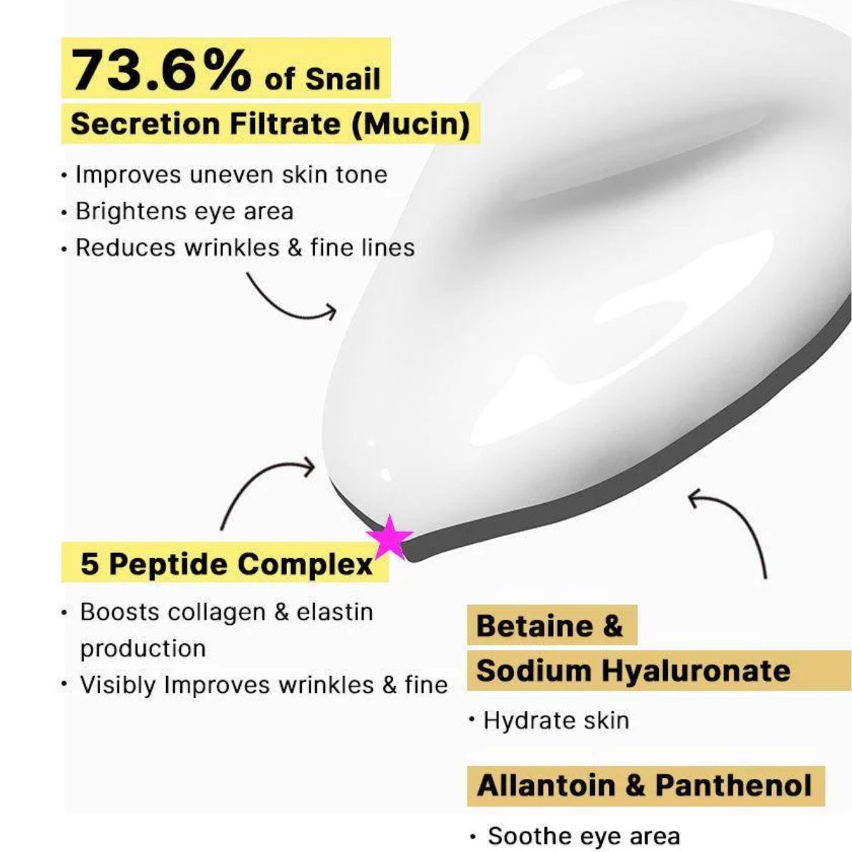 Ενυδατική κρέμα ματιών εμπλουτισμένη με βλεννίνη σαλιγκαριού. Προστατεύει, ενισχύει τη φωτεινότητα της περιοχής των ματιών και μειώνει αισθητά τους μαύρους κύκλους.