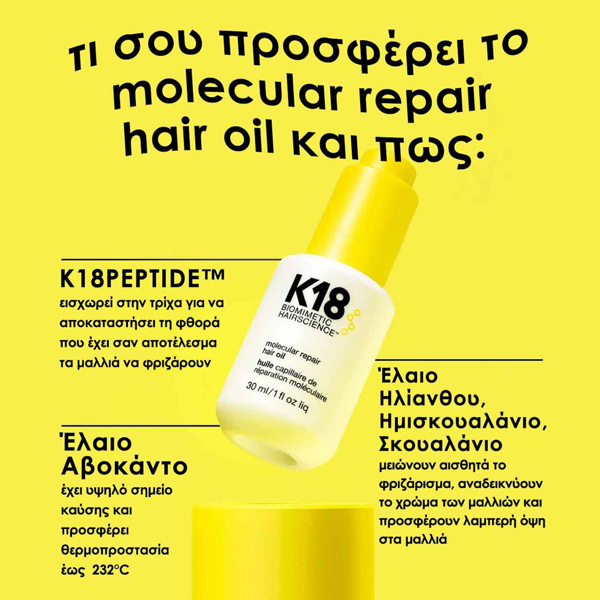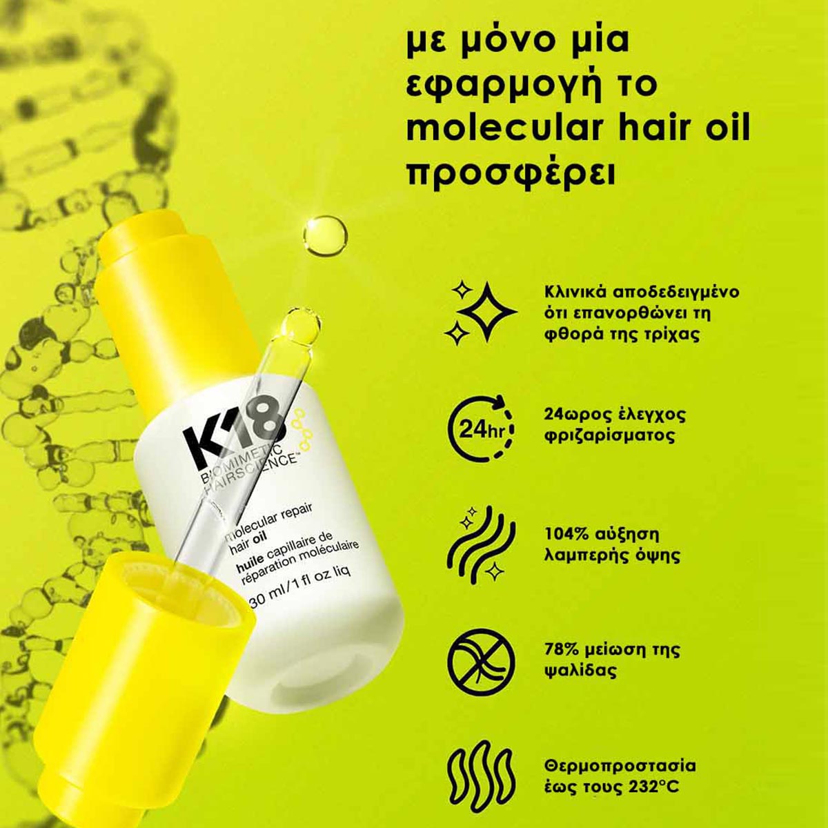 K18 Molecular Repair Hair Oil 10ml! Το νέο πρωτοποριακό ανάλαφρο έλαιο που σχεδιάστηκε με τη βοήθεια της βιοτεχνολογίας, είναι κατάλληλο για όλους τους τύπους μαλλιών και προσφέρει ενδυνάμωση, αποκατάσταση της φθοράς, αισθητή μείωση του φριζαρίσματος της ίνας της τρίχας σε δύο επίπεδα και ενίσχυση της λάμψης.