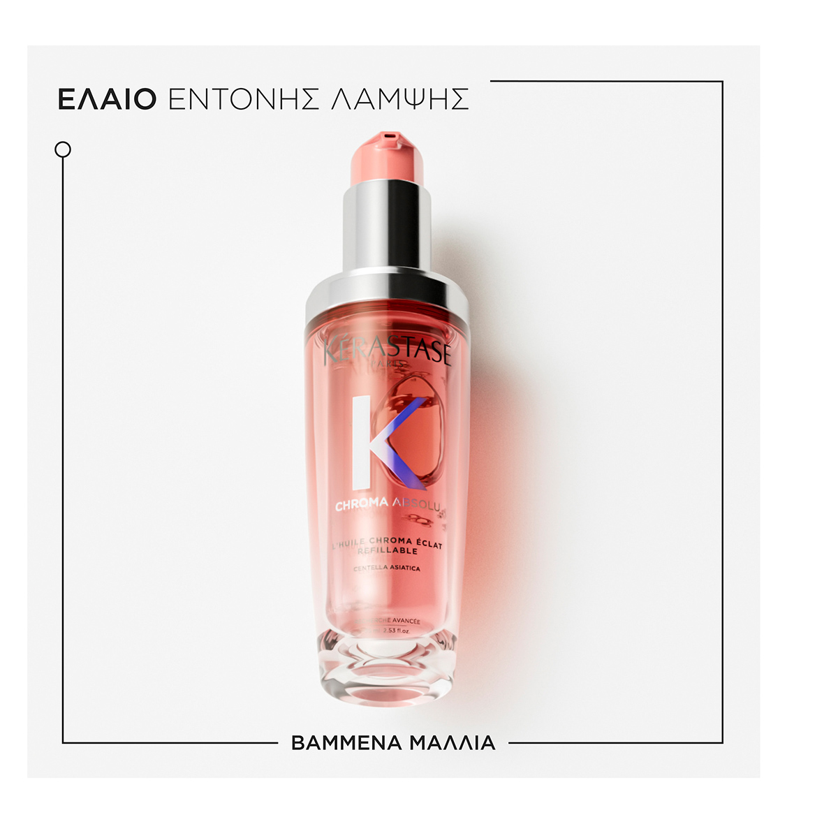 Refill it again & again! Η refill συσκευασία του ελαίου Chroma Éclat προσφέρει λάμψη μεγάλης διάρκειας στα βαμμένα μαλλιά. Το έλαιο αυτό είναι εμπλουτισμένο με Centella Asiatica, ένα άγριο φυτό που αναπτύσσεται σε τροπικό περιβάλλον, για να διατηρεί το χρώμα των μαλλιών και να τα περιβάλλει με ένα πολυτελές άρωμα.