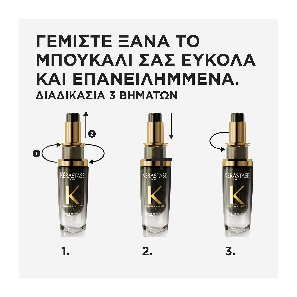 Μπορείτε να γεμίζετε εύκολα το μπουκάλι ξανά & ξανά, ακολουθώντας μια διαδικασία 3 βημάτων: 1. Ξεβιδώστε το άδειο ανταλλακτικό & βγάλτε το από το γυάλινο μπουκάλι 2. Βγάλτε το νέο ανταλλακτικό από τη συσκευασία του & βάλτε το μέσα στο γυάλινο μπουκάλι 3. Γυρίστε το ανταλλακτικό δεξιόστροφα για να κλειδώσει & ανακυκλώστε το άδειο ανταλλακτικό αφού αφαιρέσετε την αντλία