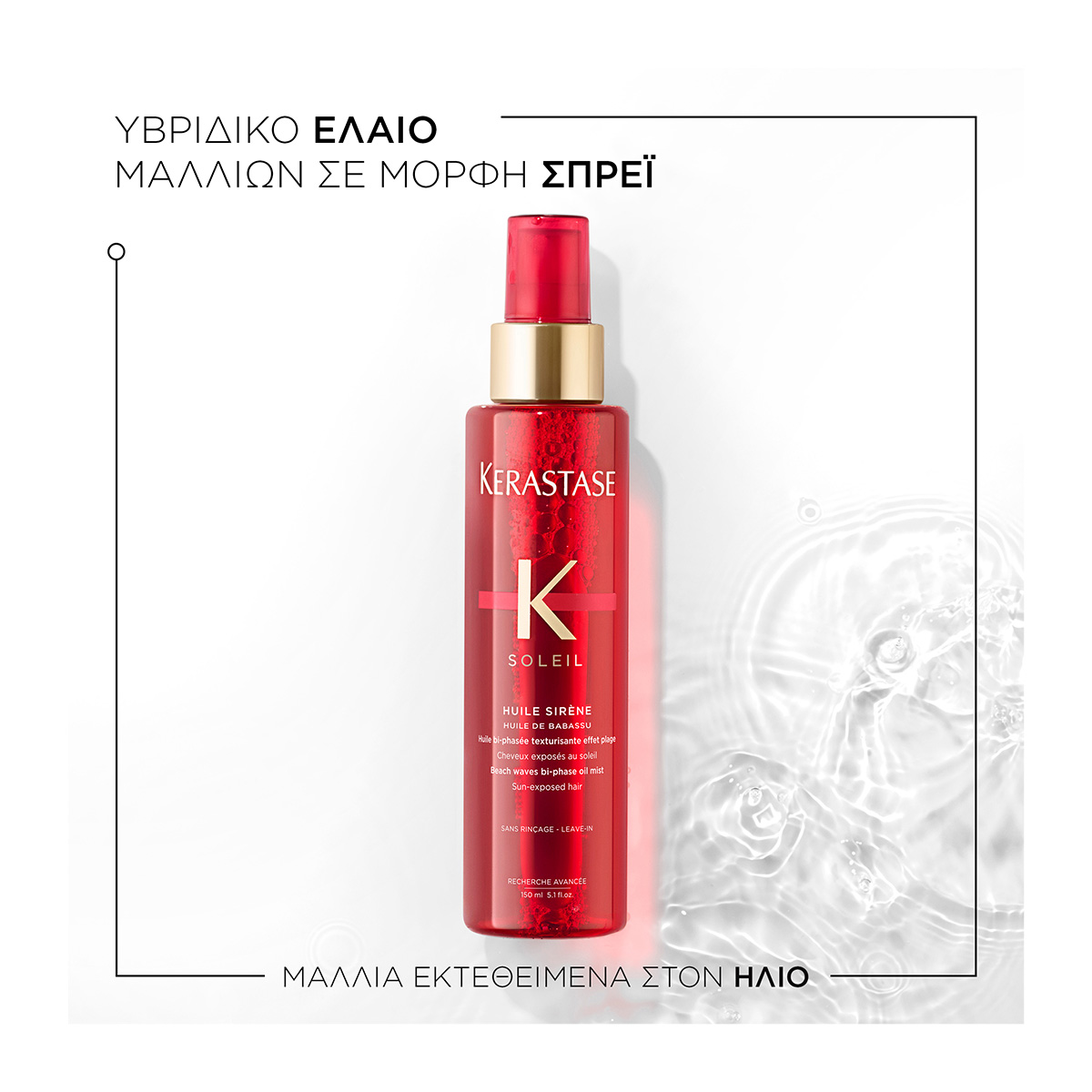 Διφασικό έλαιο σε μορφή σπρέι για κυματιστά μαλλιά, το Kerastase Soleil Hulie Sirene είναι ένα σπρέι πολλαπλής προστασίας εμποτισμένο με έλαιο babassu και φίλτρο UV, που ενυδατώνει και ενισχύει τα κυματιστά μαλλιά, με ελαστικό κράτημα