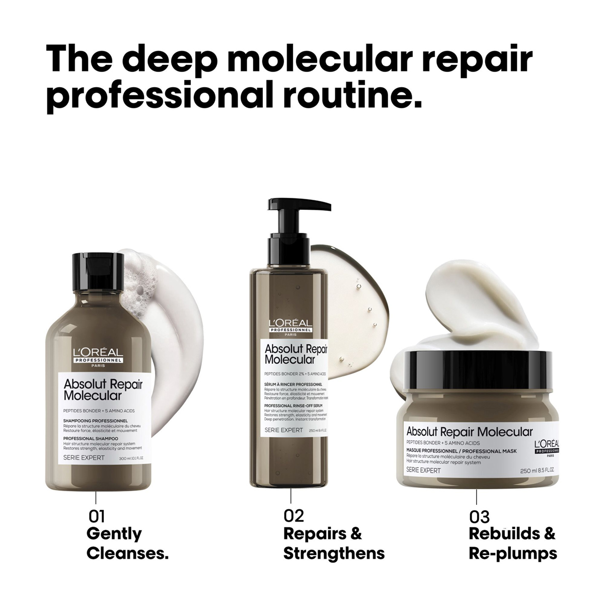 Το L’Oréal Professionnel Absolut Repair Molecular Μάσκα μοριακής επανόρθωσης για ταλαιπωρημένα μαλλιά 250 ml ξαναγεμίζει τα μοριακά στρώματα της τρίχας και εφαρμόζεται