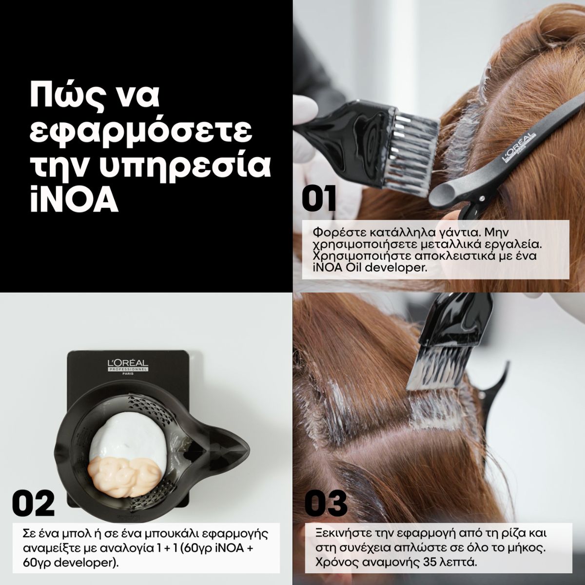 Αναμίξτε σε αναλογία 1 προς 1, δηλαδή 60 g (1 σωληνάριο) INOA ODS Crème Colourant + 60 g INOA ODS Rich Oxydant 20vol ή 30vol. Ανακατεύουμε μέχρι να έχουμε μια πλούσια κρεμώδη υφή.