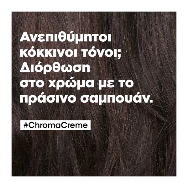 • Καθώς το πράσινο χρώμα αποδυναμώνει τους κόκκινους τόνους, επιλέξτε το Chroma Crème με πράσινες χρωστικές για σκούρα καστανά έως μαύρα μαλλιά