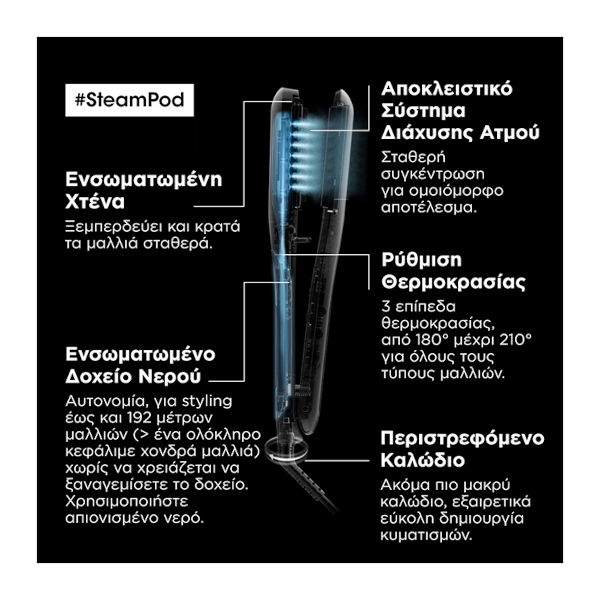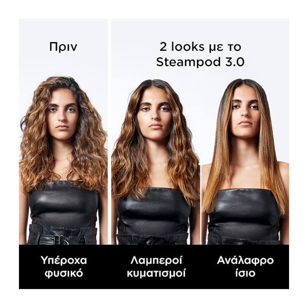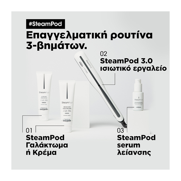 • Για βέλτιστο αποτέλεσμα, συνιστούμε να χρησιμοποιείτε το SteamPod 3.0 σε συνδυασμό με το πρόγραμμα περιποίησης SteamPod που θα σας προτείνει ο κομμωτής σας. Το πρόγραμμα SteamPod εξασφαλίζει βέλτιστη προστασία της τρίχας, έλεγχο του φριζαρίσματος μέχρι και για 24 ώρες, και μέγιστη λείανση για μαλλιά απαλά και λαμπερά, με φυσική κίνηση. Αποτελείται από τα παρακάτω προϊόντα: