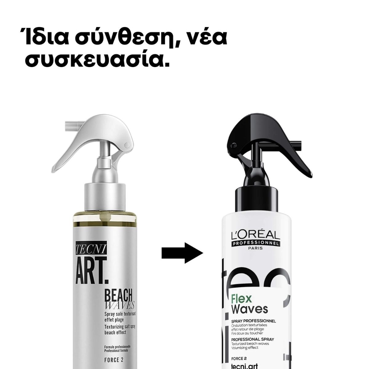 Το Tecni.ART Flex Waves από τη L’Oréal Professionnel είναι ένα επαγγελματικό σπρέι υφής με αλατόνερο για μοδάτο look παραλίας, χωρίς σκληρή υφή. Επιτρέπει ευέλικτα στυλ μαλλιών, προσφέροντας looks για beach waves.