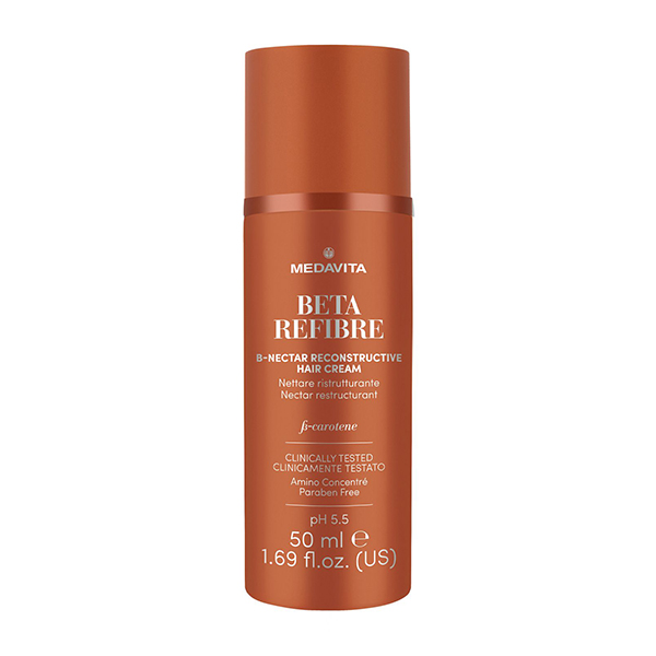 Medavita Beta Refibre Nettare , ένα νέκταρ ομορφιάς για μαλλιά, των οποίων η καλλυντική επίδραση είναι άμεση. Αυτή η κρέμα τιθασεύει τα μαλλιά και τους δίνει λαμπερή όψη από την πρώτη κιόλας εφαρμογή. Περιέχοντας β-καροτίνη, η οποία βοηθά ενεργά στη διαδικασία αναδόμησης, προστατεύει τα μαλλιά από τη φυσική φθορά που προκαλείται από τη φυσική αφυδάτωση και γήρανση, καθώς επίσης κι από χημικούς και περιβαλλοντικούς παράγοντες.