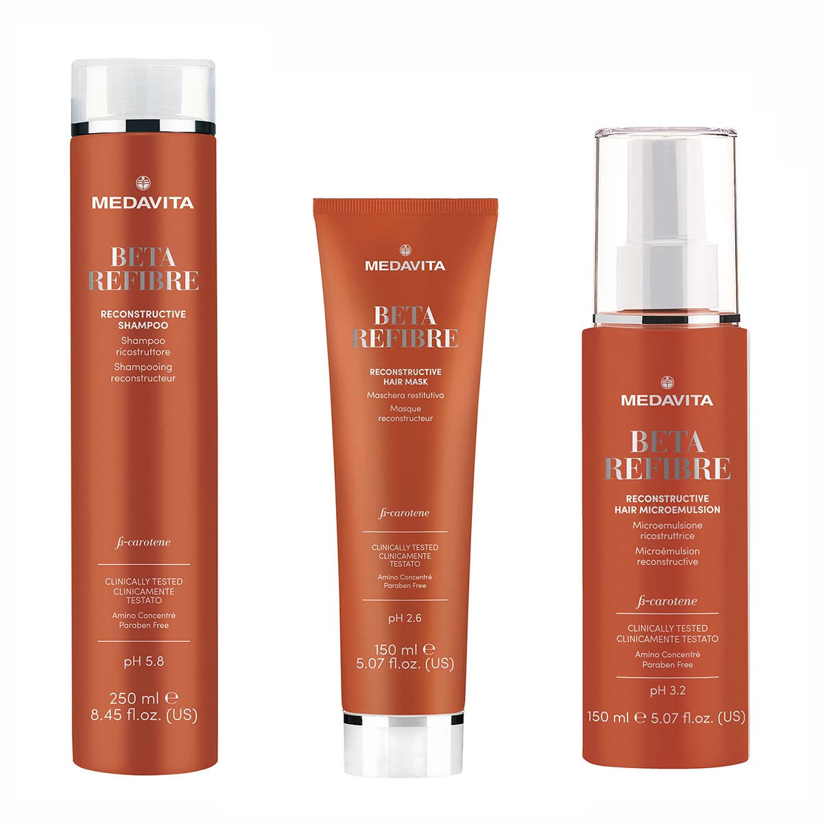 Το Medavita Beta Refibre Σετ Αναδόμησης περιλαμβάνει το Medavita Refibre Σαμπουάν Αναδόμησης, τη Medavita Refibre Maschera Μάσκα Τόνωσης και το Medavita Beta Refibre Microemulsione Γαλάκτωμα Αναδόμησης.