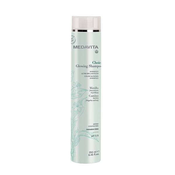 Medavita Choice Color Glow σαμπουάν με ειδική φόρμουλα που εξασφαλίζει έναν ισορροπημένο καθαρισμό, ενώ παράλληλα το αποκλειστικό σύμπλεγμα ελαίων, πλούσιο σε φυσικά αντιοξειδωτικά, δίνει στην ίνα ακαταμάχητη λάμψη και θρέψη, προστατεύοντάς τη, αποκαθιστώντας τη φυσική της προστασία και προλαμβάνοντας την αφυδάτωση.