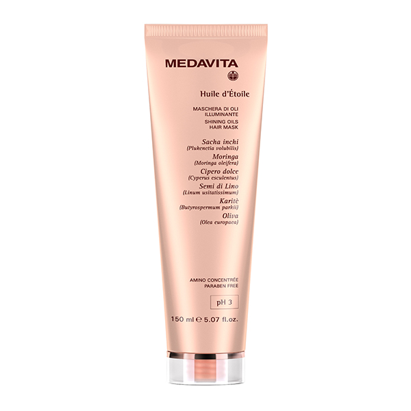 Medavita Huile D’Etoile μάσκα που ενισχύει τη λάμψη και την απαλότητα των μαλλιών. Κάνει απαλότερη την ίνα της τρίχας χωρίς να τη βαραίνει, κάνοντας τα μαλλιά απαλά και μεταξένια. Μαλακώνει, θρέφει, προστατεύει, λειαίνει, δίνει λάμψη και αποτρέπει την δημιουργία κόμπων.