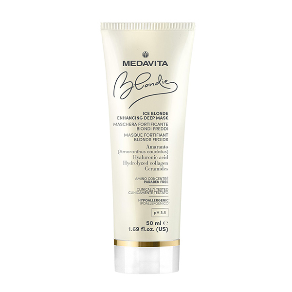 Medavita Ice Bonding μάσκα ενίσχυσης χρώματος για ξανθά μαλλιά. Προστατεύει και ενισχύει τους ψυχρούς τόνους, δίνοντας στη δομή ανανεωμένο σώμα.