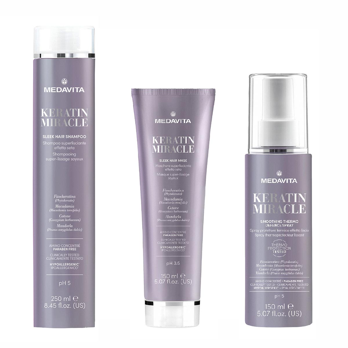 Το σετ περιλαμβάνει το Medavita Keratin Sleek Σαμπουάν Κερατίνης, τη Medavitan Keratin Sleek Μάσκα Κερατίνης και το Medavita Keratin Thermo Σπρέι Θερμοπροστασίας Κερατίνης.