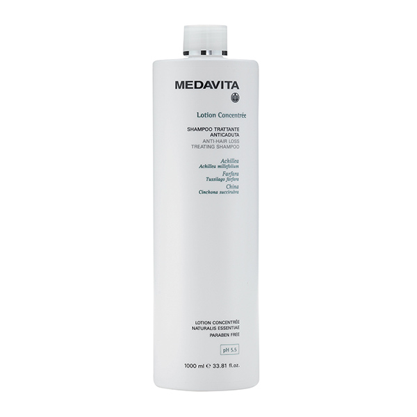 Medavita Lotion Concentree Trattante σαμπουάν θεραπείας κατά της τριχόπτωσης pH 5.5. Χάρη στην ισχυρή και αποσυμφορητική δράση των βοτάνων Μυριόφυλλου, Βήχιου και China, που αφενός εμποδίζουν την αποδυνάμωση και επακόλουθη πτώση των μαλλιών, αφετέρου ευνοούν την οξυγόνωση και τις μεταβολικές εναλλαγές. Καθιστά τα μαλλιά μαλακά, λαμπερά, και ανθεκτικά σε κάθε τους πτυχή.