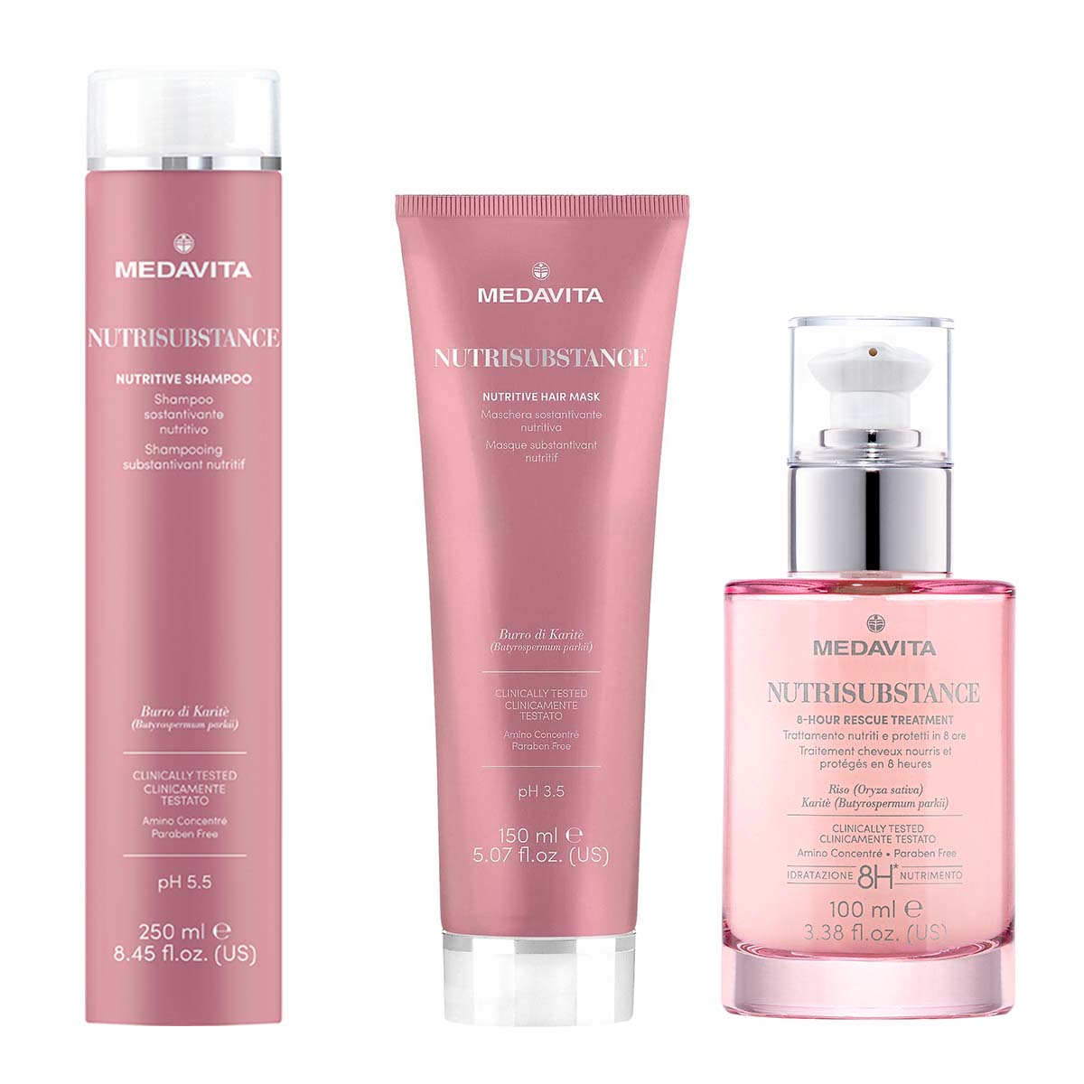 Το Medavita Nutrisubstance Σετ Θρέψης σετ περιλαμβάνει το Medavita Nutrisubstance Σαμπουάν Θρέψης, τη Medavita Nutrisubstance Μάσκα Θρέψης και την Medavita Nutrisubstance Κρέμα Θρέψης.