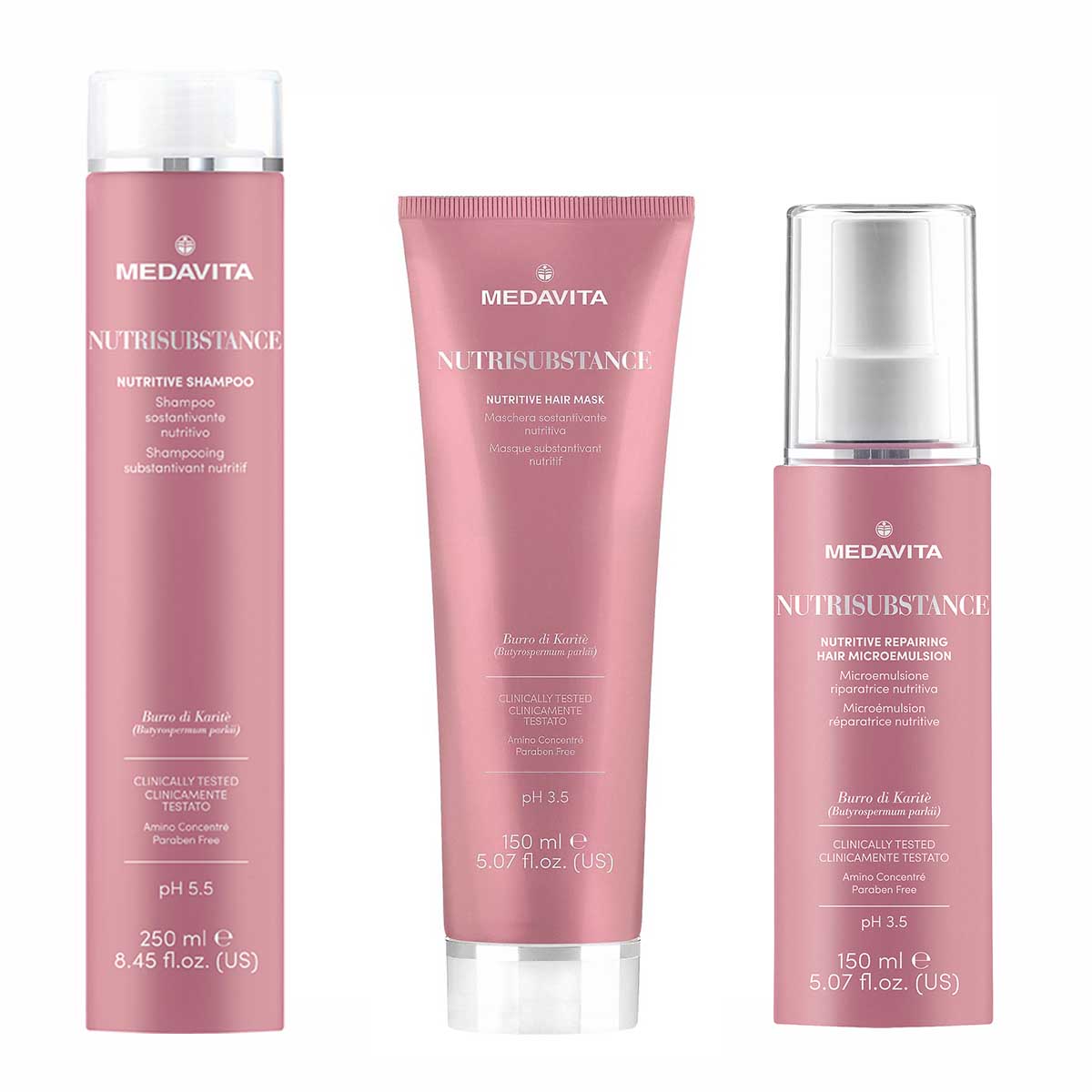 Το Medavita Nutrisubstance Σετ Θρέψης σετ περιλαμβάνει το Medavita Nutrisubstance Σαμπουάν Θρέψης, τη Medavita Nutrisubstance Μάσκα Θρέψης και το Medavita Nutrisubstance Σπρέι Θρέψης.