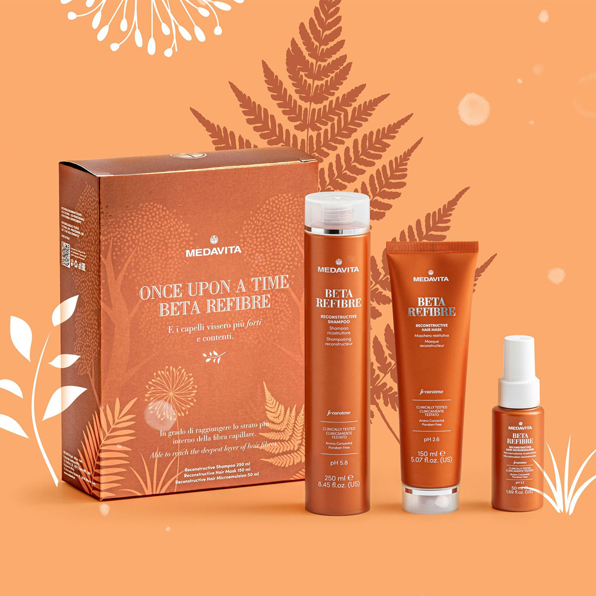 Χριστουγεννιάτικο εορταστικό σετ για αναδόμηση μαλλιών Medavita Refibre “Once Upon a Time” το οποίο περιλαμβάνει σαμπουάν 250ml, μάσκα τόνωσης 150ml και σπρέι γαλάκτωμα 50ml.
