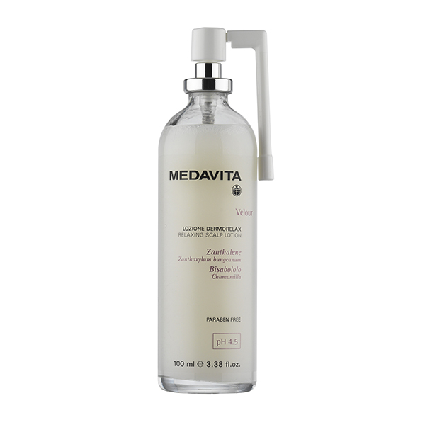 Medavita Velour Dermorelax λοσιόν δερματικής χαλάρωσης. Χάρη στη συνδυαστική δράση του βοτάνου Zanthalene και της Βισαβολόλης, η συγκεκριμένη εντατική θεραπεία εξαλείφει την φαγούρα, την δυσφορία και την ένταση του τριχωτού της κεφαλής. Δρα άμεσα για να καταστείλει όλους τους τύπους ερεθισμού του δέρματος, και είναι μία εξαιρετικά άμεση θεραπεία για πριν και μετά όποιας τεχνικής εργασίας στο κεφάλι μας.