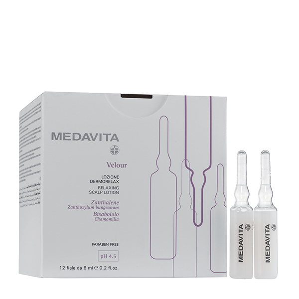 Medavita Velour Dermorelax λοσιόν δερματικής χαλάρωσης. Χάρη στη συνδυαστική δράση του βοτάνου Zanthalene και της Βισαβολόλης, η συγκεκριμένη εντατική θεραπεία εξαλείφει την φαγούρα, την δυσφορία και την ένταση του τριχωτού της κεφαλής. Δρα άμεσα για να καταστείλει όλους τους τύπους ερεθισμού του δέρματος, και είναι μία εξαιρετικά άμεση θεραπεία για πριν και μετά όποιας τεχνικής εργασίας στο κεφάλι μας.