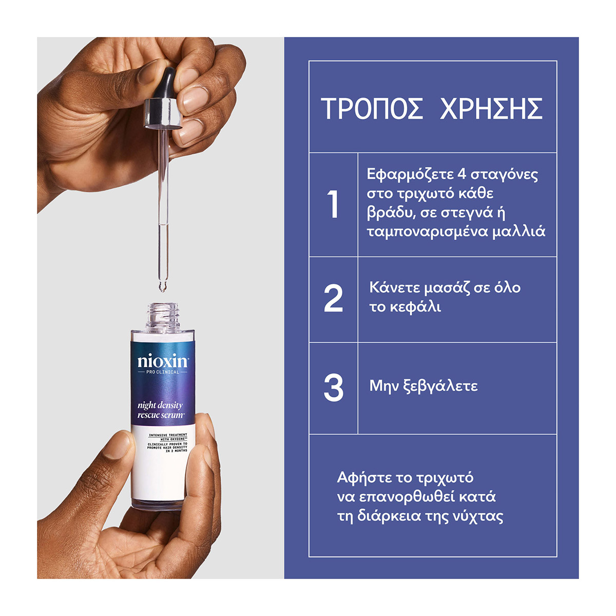 Η Nioxin Night Density Rescue 70ml αποτελεί μία θεραπεία νυκτός χωρίς ξέβγαλμα που αυξάνει αποδεδειγμένα την πυκνότητα των μαλλιών, μειώνοντας την τριχόπτωση* που σχετίζεται με τις βλάβες από την οξείδωση του τριχωτού της κεφαλής.