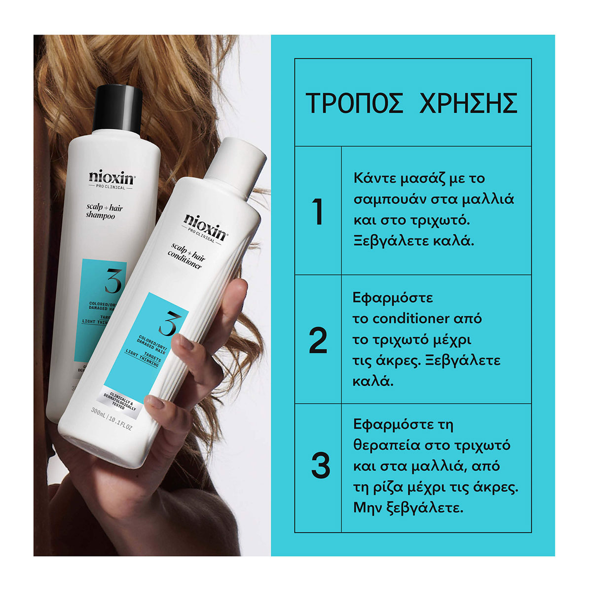 To Nioxin Σύστημα 3 Trial Kit (Σαμπουάν 150ml, Conditioner 150ml, Θεραπεία 50ml) αποτελεί μία ολοκληρωμένη επαγγελματική θεραπεία πύκνωσης για ελαφρώς αραιά, λεπτά, βαμμένα μαλλιά.