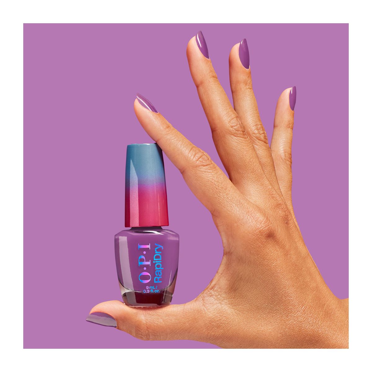 Η OPI παρουσιάζει την σειρά RapiDry, που αποτελείται από 30 αποχρώσεις καθώς κι ένα διάφανο 3 σε 1 βερνίκι, που χαρίζουν τέλεια νύχια σε μόλις 60 δευτερόλεπτα με αποτέλεσμα που διαρκεί πολλές μέρες. Δοκιμάστε αυτό το κρεμώδες μοβ και βγείτε έξω σε χρόνο ντε τε.