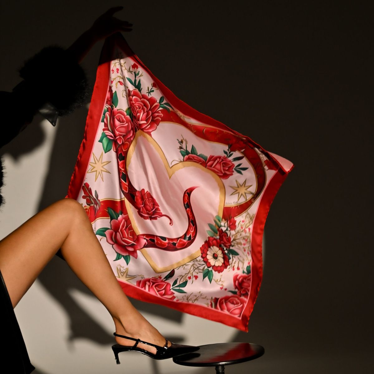 Το Serpent Blossoms είναι ιδανικό για να φορεθεί ως φουλάρι δεμένο στα μαλλιά. Το τολμηρό σχέδιο με τα φίδια και τα άνθη προσθέτει μια μοναδική και ρομαντική πινελιά σε κάθε εμφάνιση.