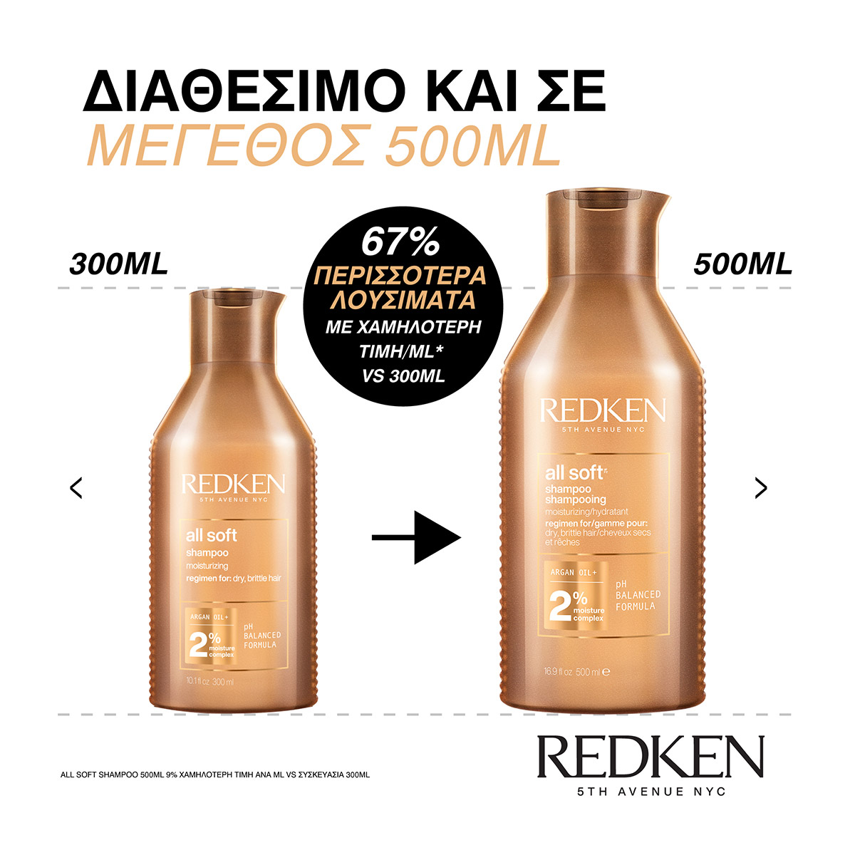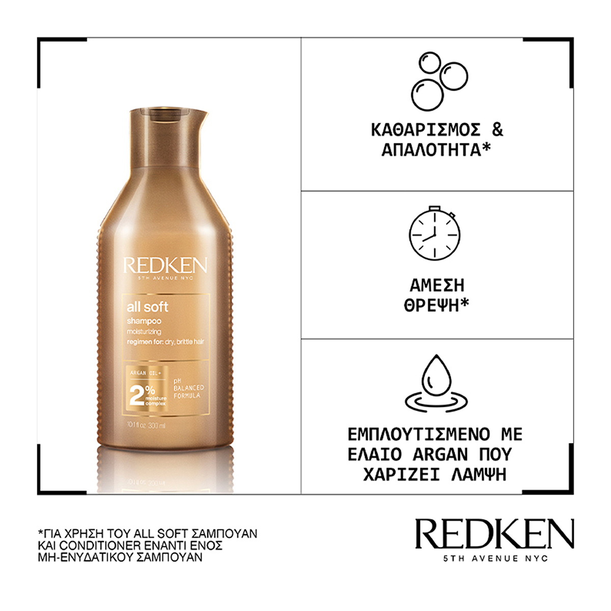 Επαγγελματική σύνθεση για ξηρά, εύθραυστα μαλλιά. Το Redken All Soft αναπληρώνει άμεσα τα επίπεδα υγρασίας ενώ προσφέρει απαλό καθαρισμό και μεταξένια απαλότητα.