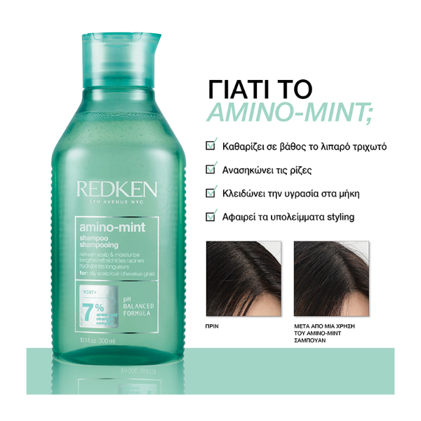 Το σαμπουάν Amino-Mint της Redken προσφέρει βαθύ καθαρισμό στο τριχωτό, βοηθά στην εξισορρόπηση του pH της τρίχας και καταπραΰνει από τους ερεθισμούς, χωρίς να βαραίνει τα μαλλιά.