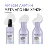 Σημαντικό: Το σύστημα Blondage High Bright θα πρέπει να χρησιμοποιείται μέχρι να επιτευχθεί η επιθυμητή φωτεινότητα. Μόλις επιτευχθεί η επιθυμητή φωτεινότητα, σταματήστε τη χρήση του σπρέι περιποίησης για πριν από το λούσιμο και είτε: 1. συνεχίστε να χρησιμοποιείτε μόνο σαμπουάν και conditioner ή 2. συνεχίστε με κάποια άλλη σειρά περιποίησης της Redken.