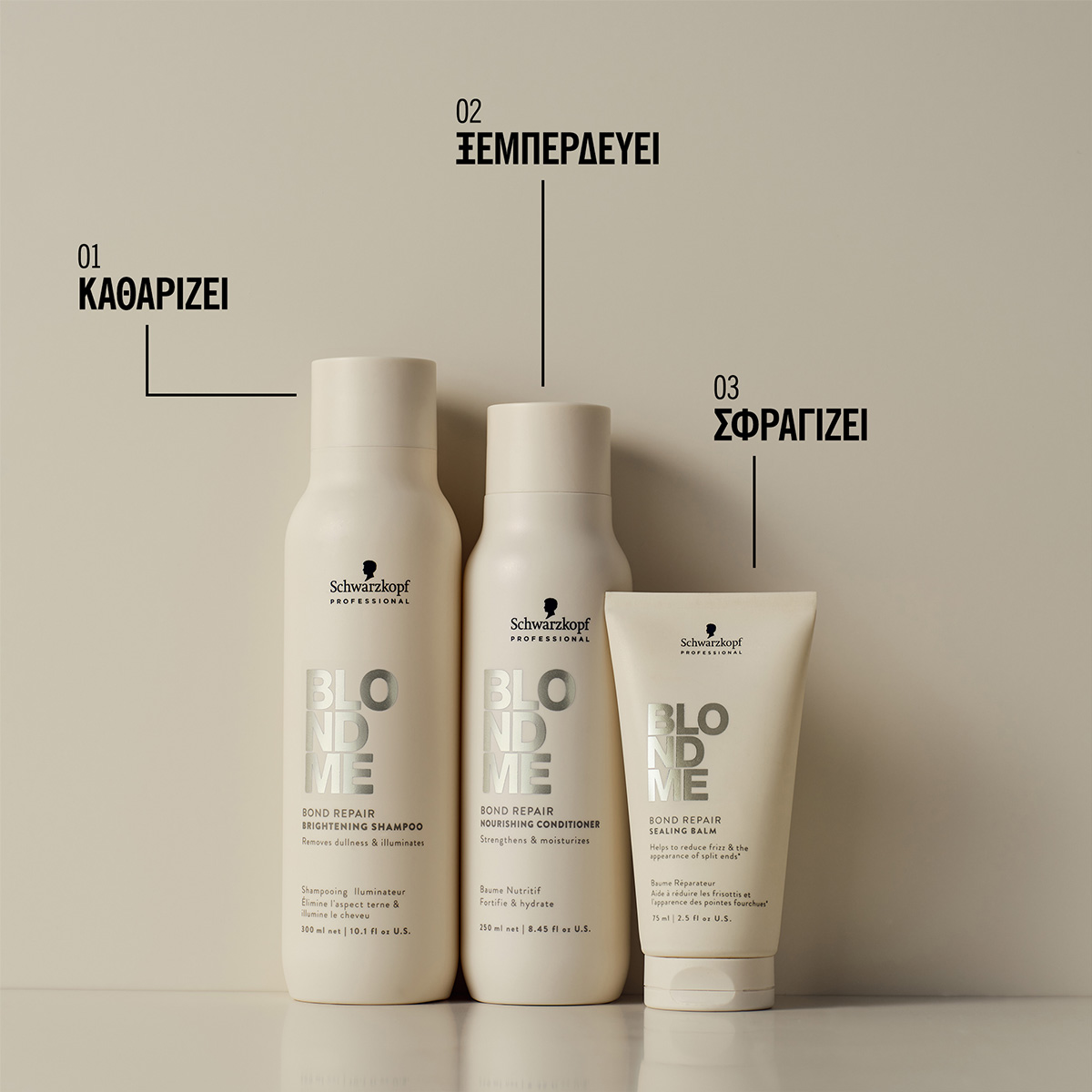 BOND REPAIR TECHNOLOGY Αυτή η καινοτόμος τεχνολογία δημιουργεί ένα εξελιγμένο δίκτυο δυο τύπων δεσμών, δηλαδή δεσμών υδρογόνου και ιοντικών δεσμών, που δουλεύουν παράλληλα για να προωθήσουν μια στιβαρή αλλά και ευέλικτη δομή στην τρίχα. Σε συνδυασμό με το θρεπτικό Αμυγδαλέλαιο, οι συνθέσεις μας προστατεύουν τα ξανθά μαλλιά και τα αποτρέπουν από το να γίνουν ξηρά, ατίθασα και πορώδη. Τα ελαφριά πολυμερή σε συνδυασμό με το Λευκό Τσάι γνωστό για τις αντιοξειδοτικές & αναζωογονητικές του ιδιότητες δημιουργούν μια ασπίδα που μιμείται το φαινόμενο φύλλου λωτού που προστατεύει ενεργά το περιτρίχιο από εξωτερικούς παράγοντες όπως τους ρύπους που μπορούν να κάνουν τα ξανθά μαλλιά να φαίνονται θαμπά και άτονα.