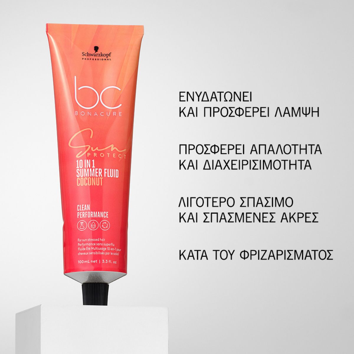 Το Schwarzkopf Professional Bonacure Sun Protect 10-in-1 Summer Fluid είναι μια πολυλειτουργική leave-in κρέμα που προσφέρει προστασία, ενυδάτωση και θρέψη στα μαλλιά κατά τη διάρκεια του καλοκαιριού. Η ελαφριά, μη λιπαρή σύνθεσή του προστατεύει τα μαλλιά από την ακτινοβολία UV, τη φθορά του ήλιου, το αλάτι της θάλασσας και το χλώριο.
