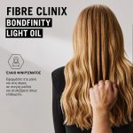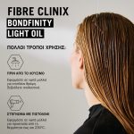 Το Fibre Clinix Bondfinity Light Oil με ενσωματωμένη Τεχνολογία BONDFINITY που κλειδώνει μέσα την κερατίνη της τρίχας, είναι ένα ανάλαφρο έλαιο έπανόρθωσης πολλαπλών χρήσεων για λεπτά εως μέτρια μαλλιά. Η σύνθεσή του με σύμπλεγμα 5 ελαίων προσφέρει απαλότητα και λάμψη στην επιφάνεια της τρίχας και λίγη υγρασία στο εσωτερικό μέρος της ίνας της τρίχας ενώ προλαμβάνει και επανορθώνει τη φθορά της τρίχας με αποτελέσματα με μεγάλη διάρκεια.