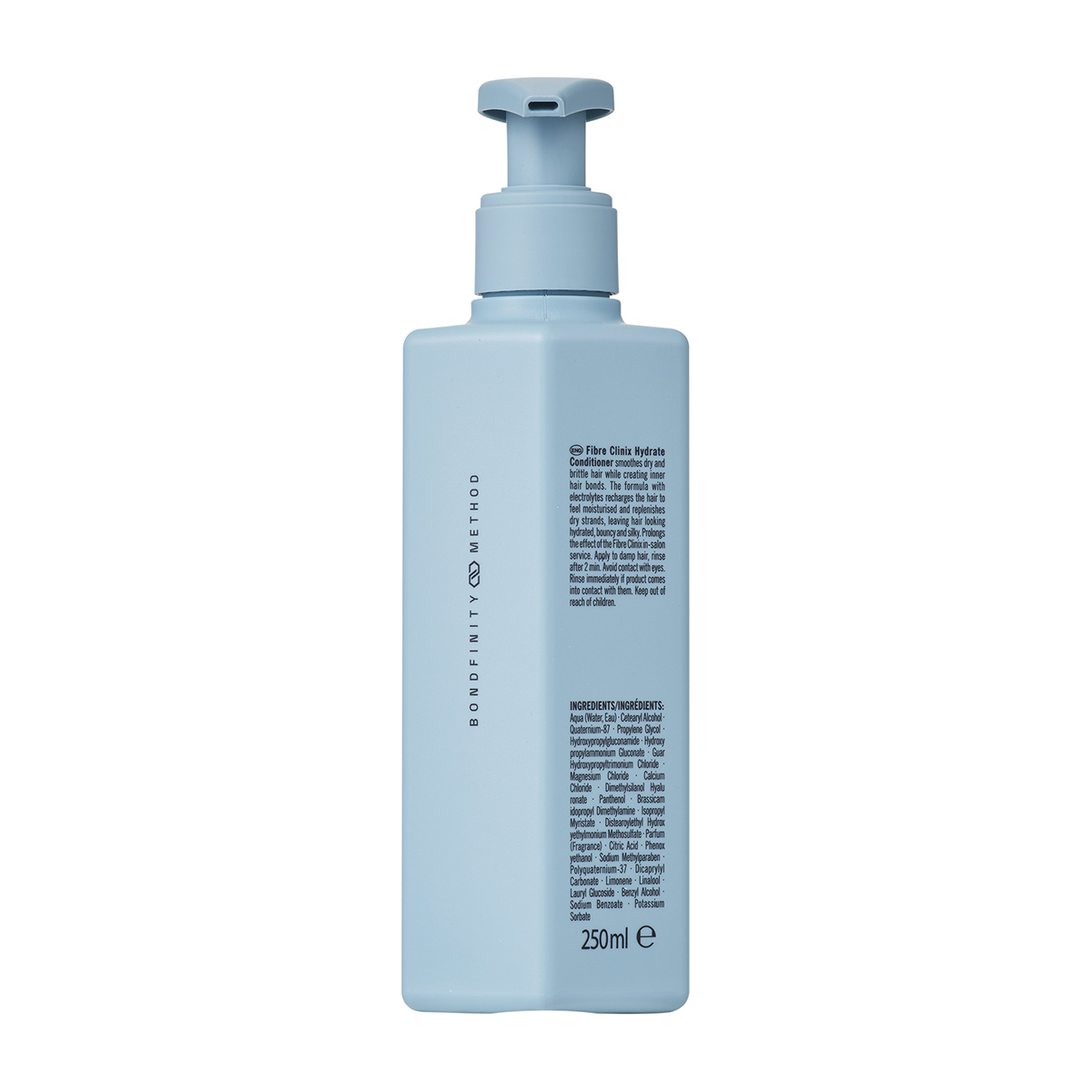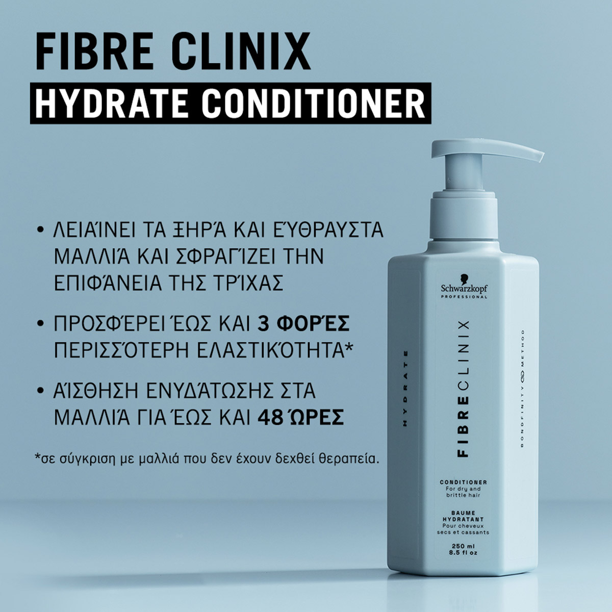 Το Fibre Clinix Hydrate Conditioner με ενσωματωμένη Τεχνολογία BONDXTENT ενδυναμώνει τα μαλλιά και δημιουργεί δεσμούς στο εσωτερικό μέρος της ίνας της τρίχας. Είναι ένα ενυδατικό conditioner επανόρθωσης που λειαίνει και διευκολύνει το ξεμπέρδεμα στα ξηρά και εύθραυστα μαλλιά, σφραγίζοντας την επιφάνεια της τρίχας. Η σύνθεση με ηλεκτρολύτες βοηθάει στη διατήρηση της υγρασίας χωρίς να βαραίνει τα μαλλιά, βελτιώνει την ελαστικότητα, τη διαχειρισιμότητα και τα αφήνει με μια αίσθηση απαλότητας και λάμψης.