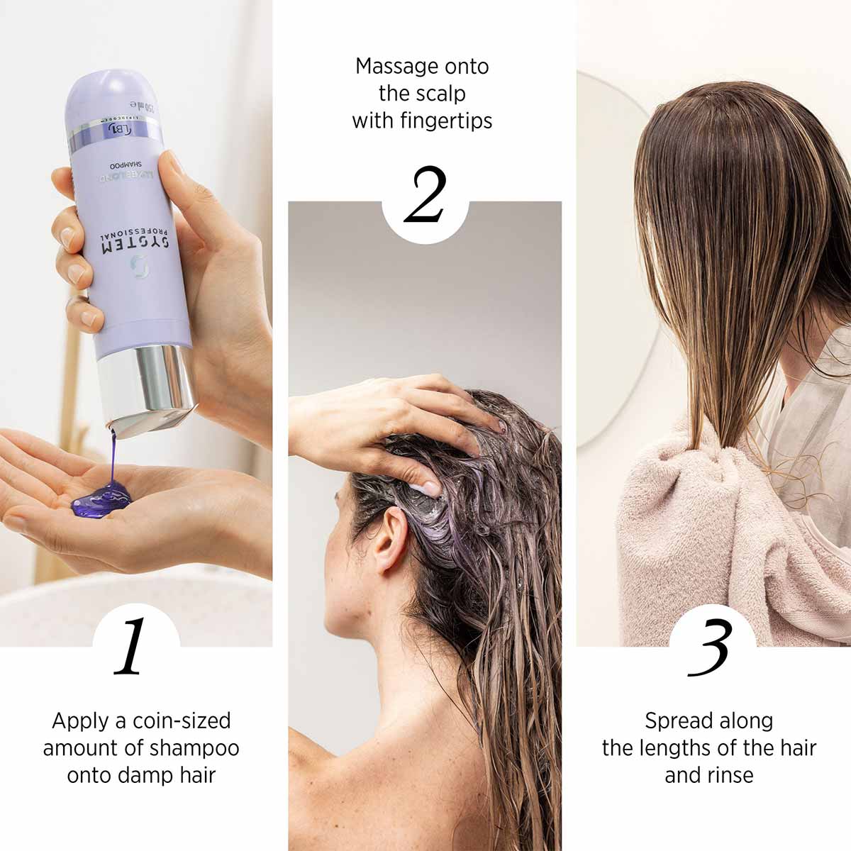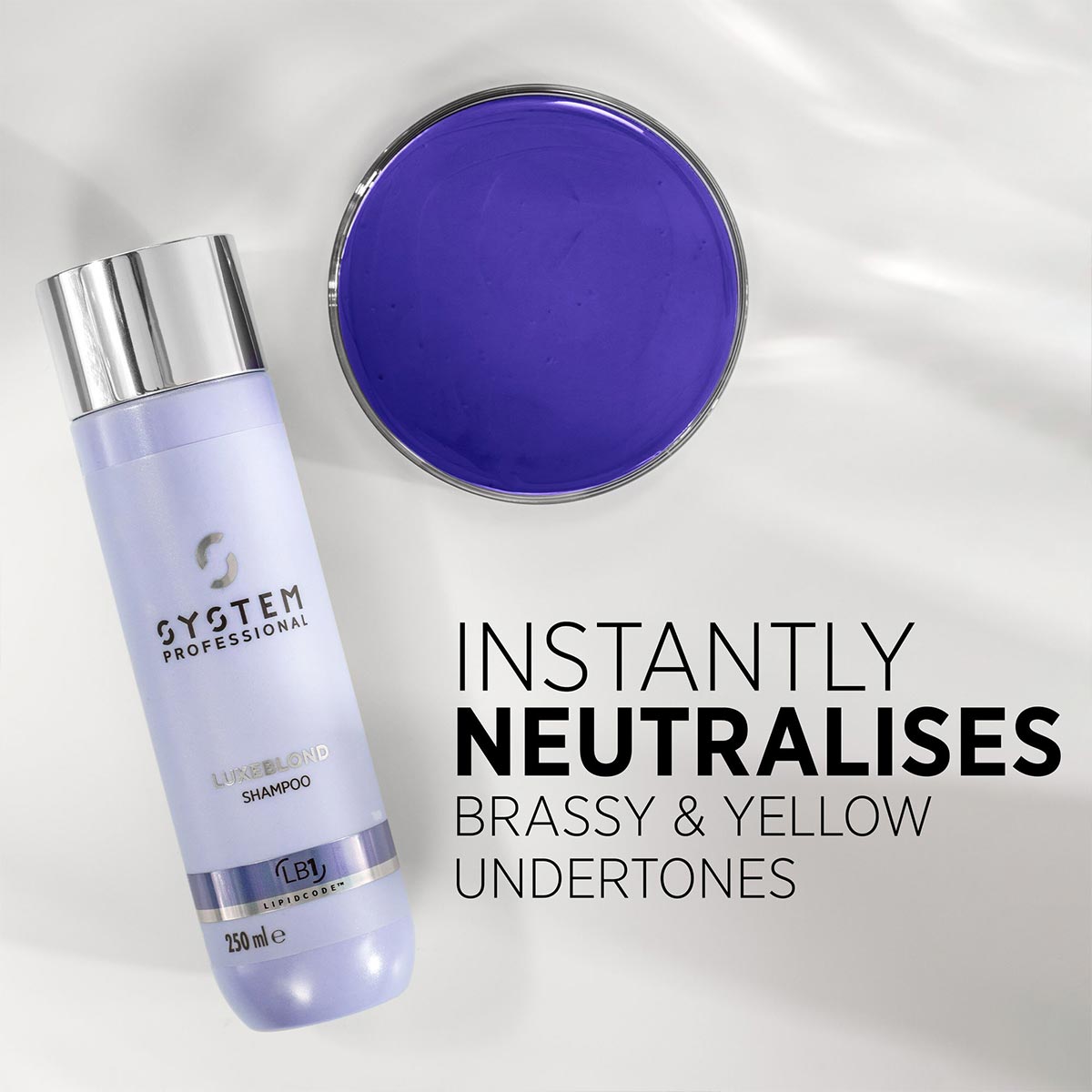 Το σαμπουάν LuxeBlond της System Professional LipidCode καθαρίζει απαλά τα ξανθά και ξανοιγμένα μαλλιά. Απομακρύνει τα συσσωρευμένα υπολείμματα και ρύπους, ενώ μειώνει τους πορτοκαλί και κίτρινους τόνους. Το εξουδετερωτικό σαμπουάν προσδίδει έναν καθαρό ξανθό τόνο και ενισχύει την ελαστικότητα.