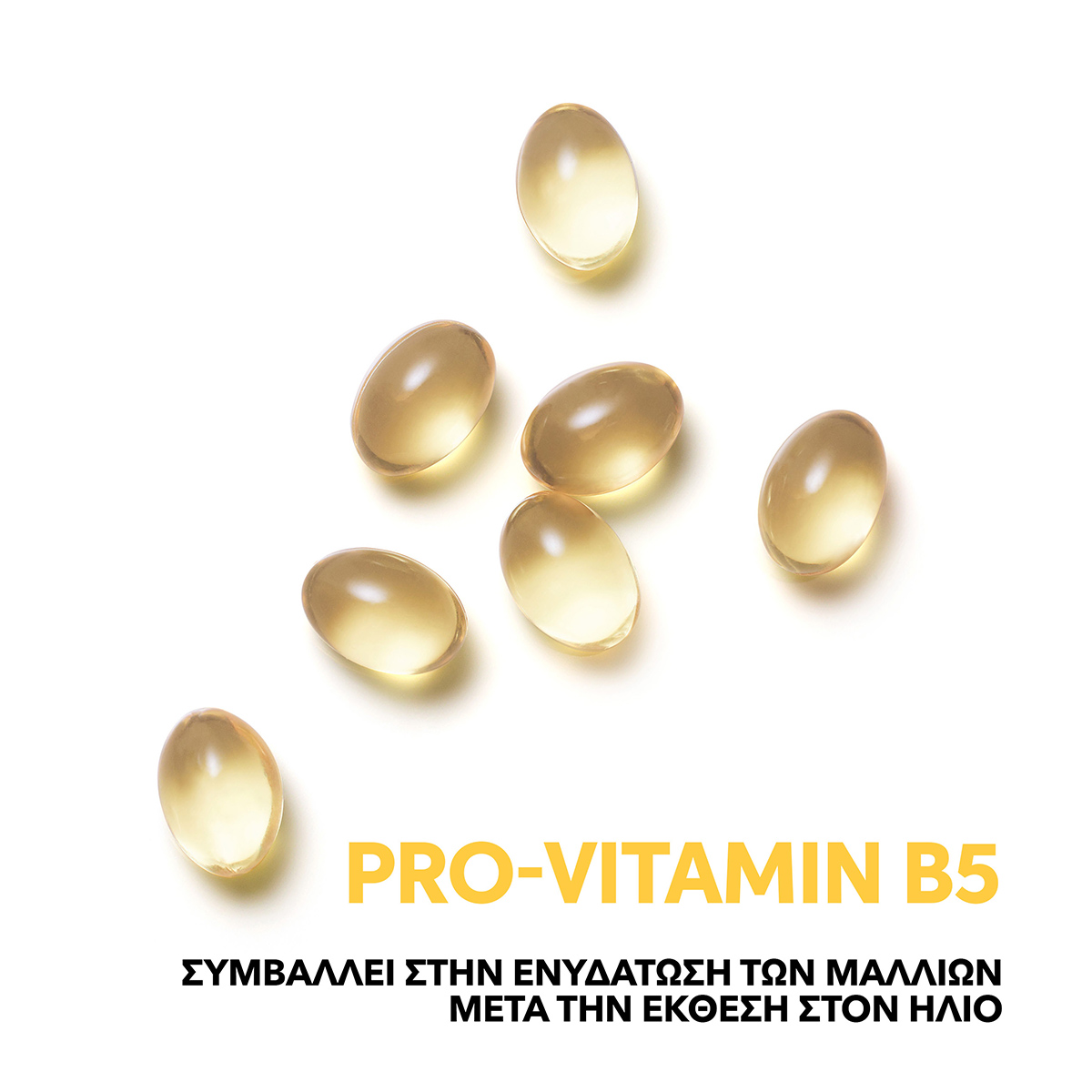 Η σύνθεση ενδυνάμωσης με Προβιταμίνη Β5 βοηθά στην ενυδάτωση των μαλλιών μετά την έκθεση στον ήλιο